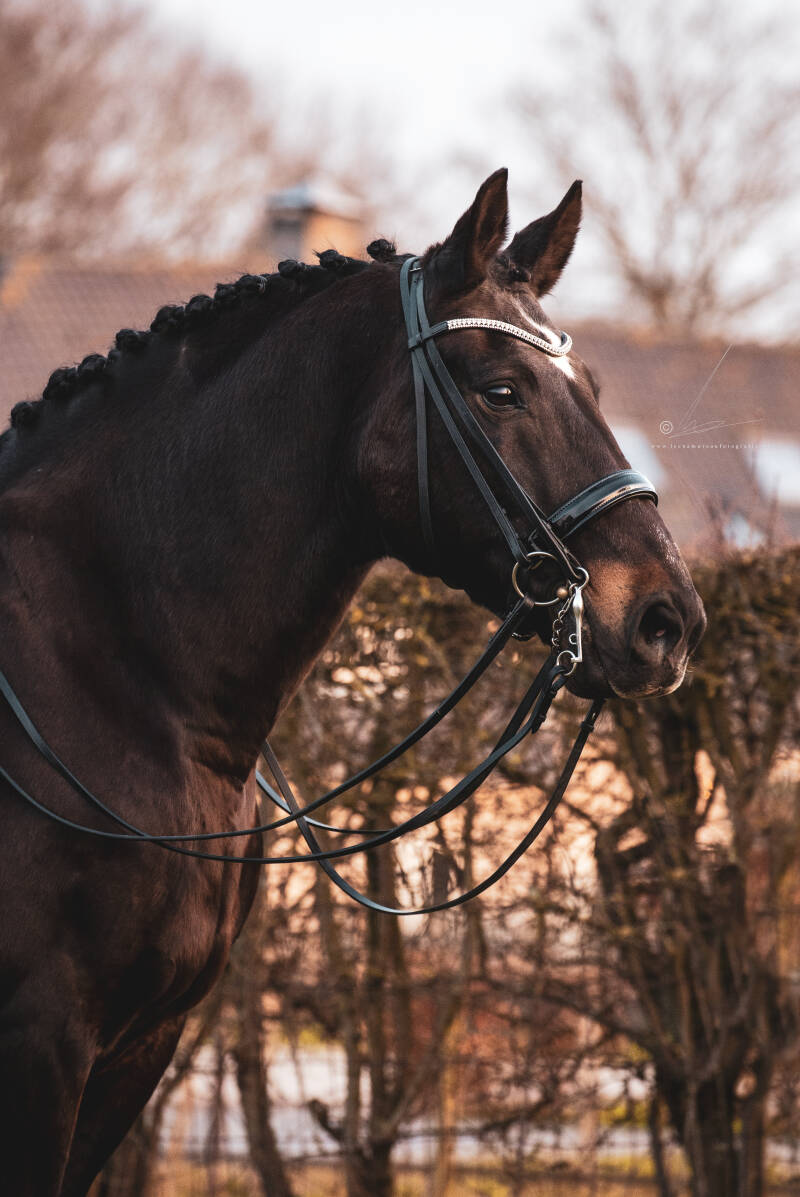 De Premiera "Prades" Zwart is een prachtig stang en trens hoofdstel met bling frontriem. Het Prades hoofdstel heeft een brede zwart onderlegde lakneusriem van 4,5cm breed. Dit stang en trens hoofdstel is verstelbaar achter de oren waardoor de gespen minder zichtbaar zijn. Verder is de Prades voorzien van blinde sluitingen.